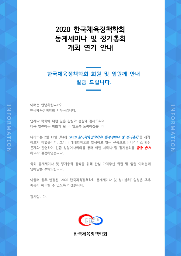 [공지] 2020 한국체육정책학회 동계세미나 및 정기총회 잠정 연기 안내